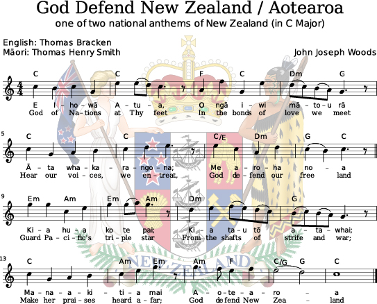 The English text is by Thomas Bracken, a poet born in Ireland who emigrated to New Zealand. John Joseph Woods composed the melody in 1875. In 1976 the New Zealand government asked the Queen to use "God Defend New Zealand" as their national anthem, which was "approved" by the monarch by law on November 21, 1977.
