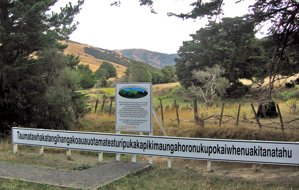 "Taumatawhakatangihangakoauauotamateapokaiwhenuakitanatahu" is the name of a 305 meters (1,001 ft) high hill in Hawke's Bay. The hill's name (with 85 characters) has also been listed in the Guinness World Records as the longest place name. It roughly translates as "The summit where Tamatea, the man with the big knees, the slider, climber of mountains, the land-swallower who traveled about, played his kōauau (flute) to his loved one."