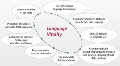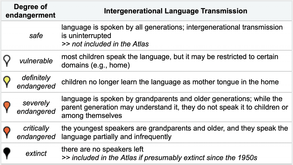According to the degree of their endangerment, languages are classified by UNESCO in the Language Atlas in six categories. Depending on their distribution (number of speakers), transmission to the next generation, and the language's social status, they are classified as follows:
