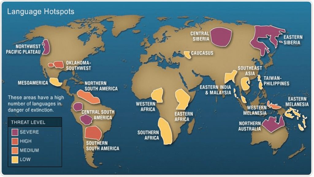 The UNESCO Language Atlas clearly shows that the languages that are dying out include the indigenous languages in North and Central America and Africa. In Mexico alone, 64 of the 68 languages spoken are threatened with extinction. Of the almost 50 languages in Peru, a large number also show a high degree of risk. Even Quechua, which several million people used to speak in Peru and Bolivia, is in danger. In Africa, more than 350 languages are considered seriously endangered. In Australia, there are over 100 languages on the list.